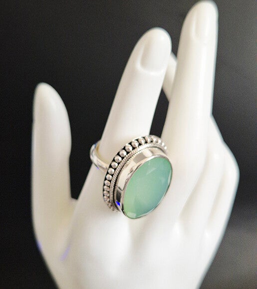 An oval green chalcedony and 925 sterling silver ring symbolizes emotional balance, growth, and tranquility, often associated with promoting calmness, inner peace, and soothing self-doubt.